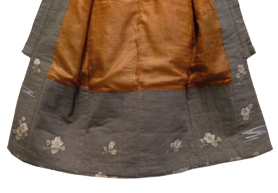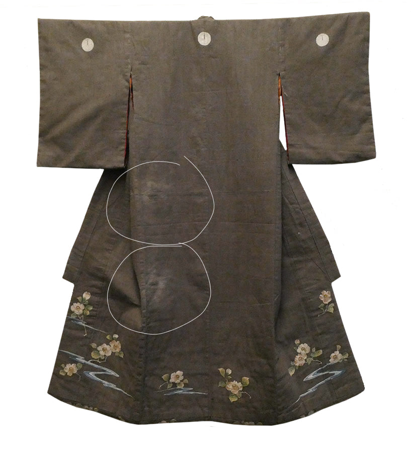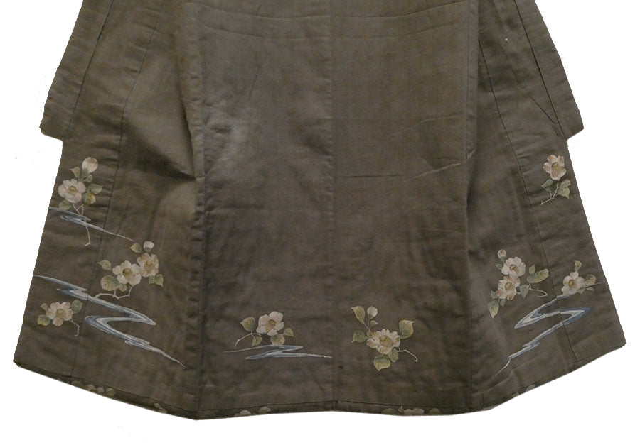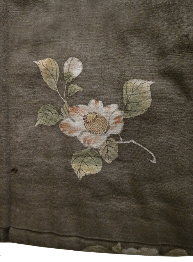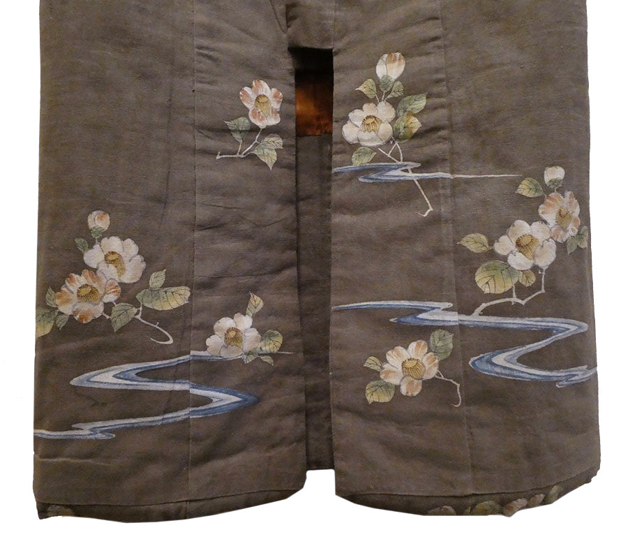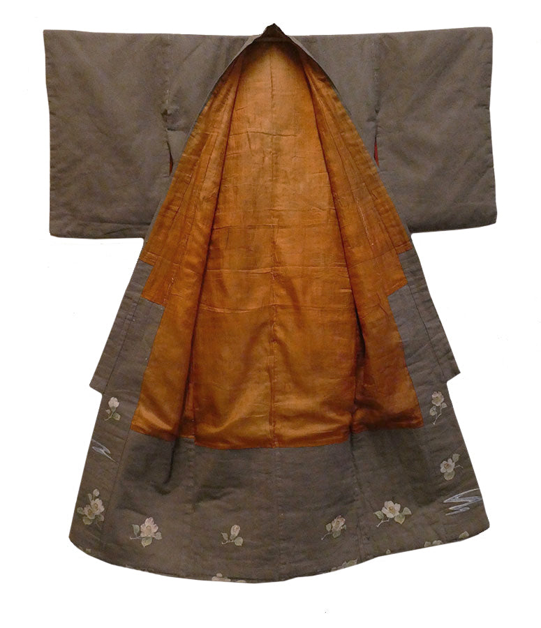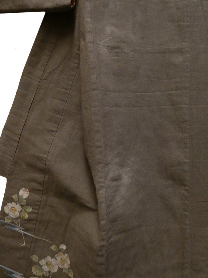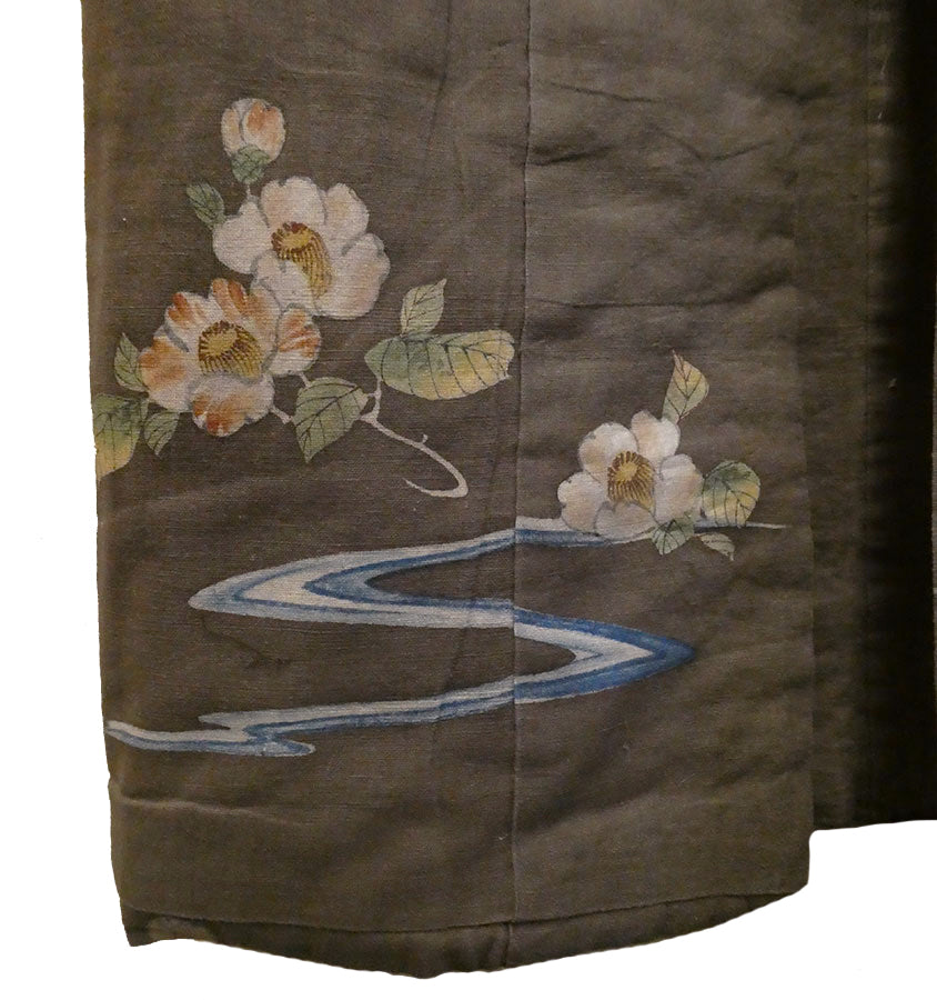 The color of the kimono is a kind of dull, rich, warm grey--taupe, if you will. The bottom hem, inside and out, is encircled with lushly hand painted camellias that are joined together by wispy areas of a blue, winding stream.