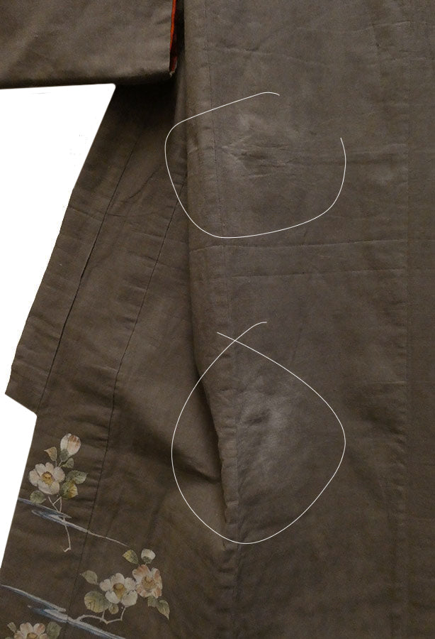The proper left, back of the kimono shows two clouds of light fading as indicated on the photos that illustrate this area. The dyes that decorate this kimono are all botanical in origin and at times they can be a bit delicate.