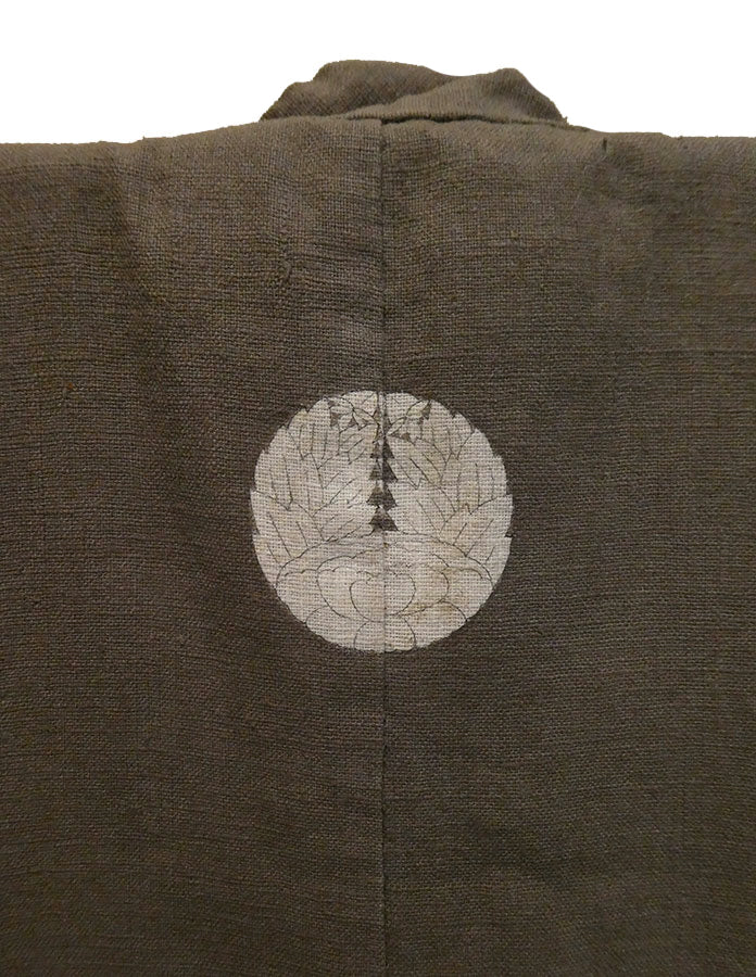 On the back are three, large family crests that have been resist dyed and them impossibly and perfectly detailed by hand: close up shots show this marvelous detail. Their large size indicates that in all probability this kimono was made in the late Edo period. Were it later, the family crests would be of a smaller size in relation to the kimono. The family crests show a stylized peony.