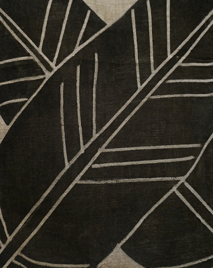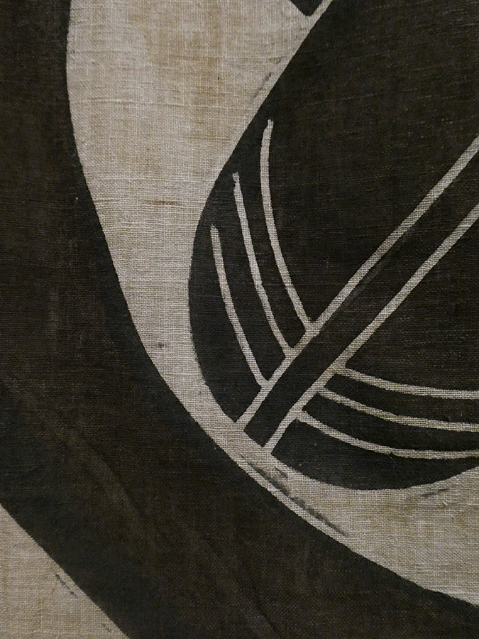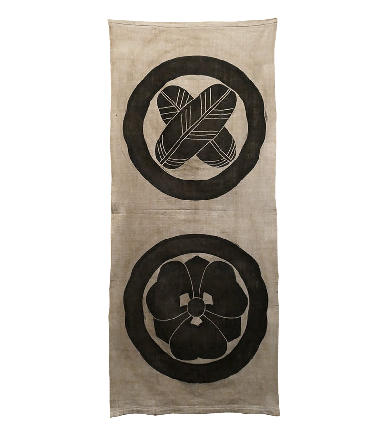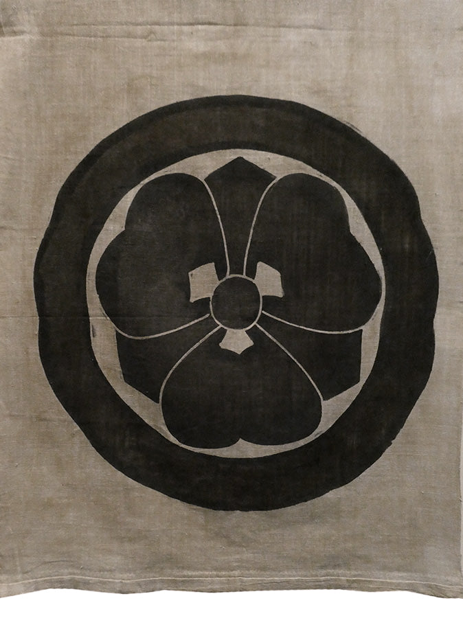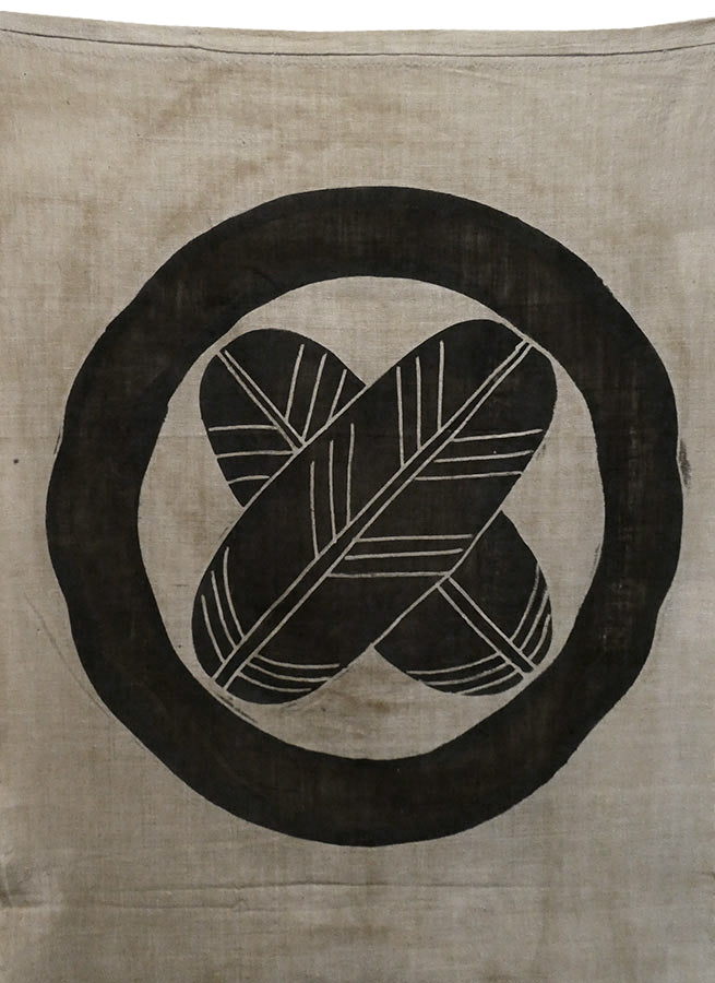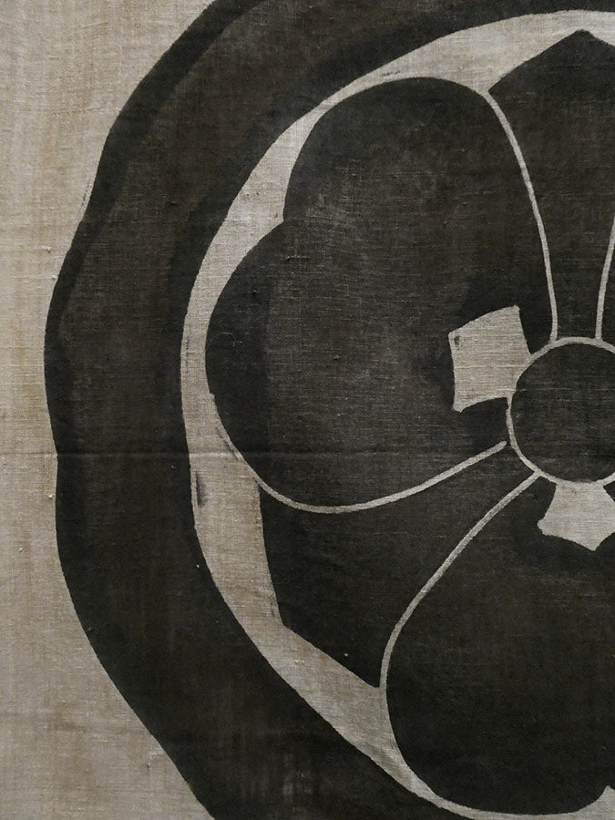 Each of the two family crests are stenciled onto the cloth using a black pigment dye and in certain cases you can see where the dyer's hand allowed the dye to stray onto an area meant to be left alone.