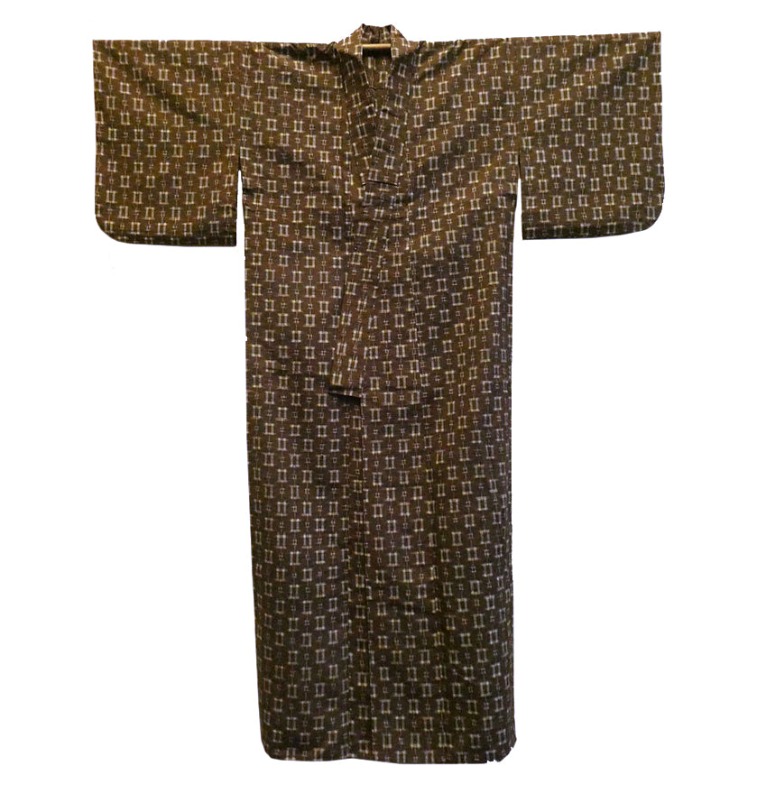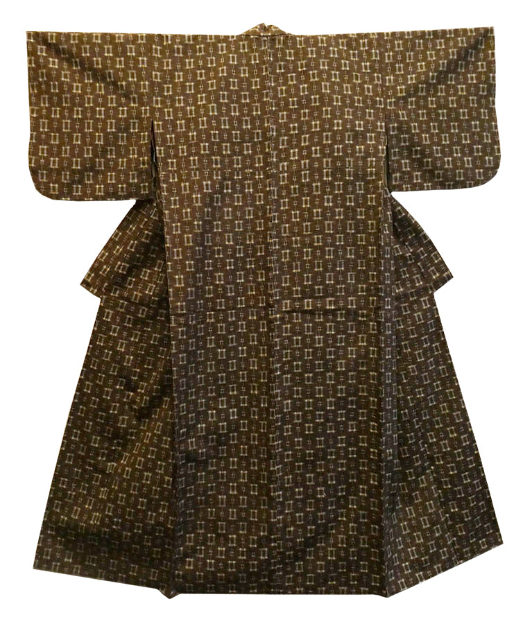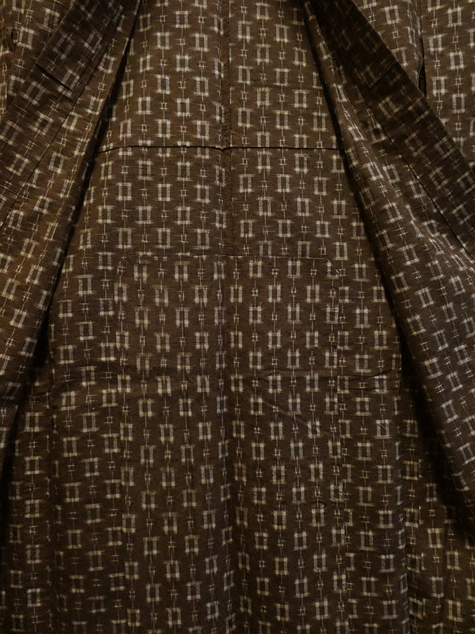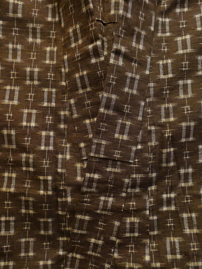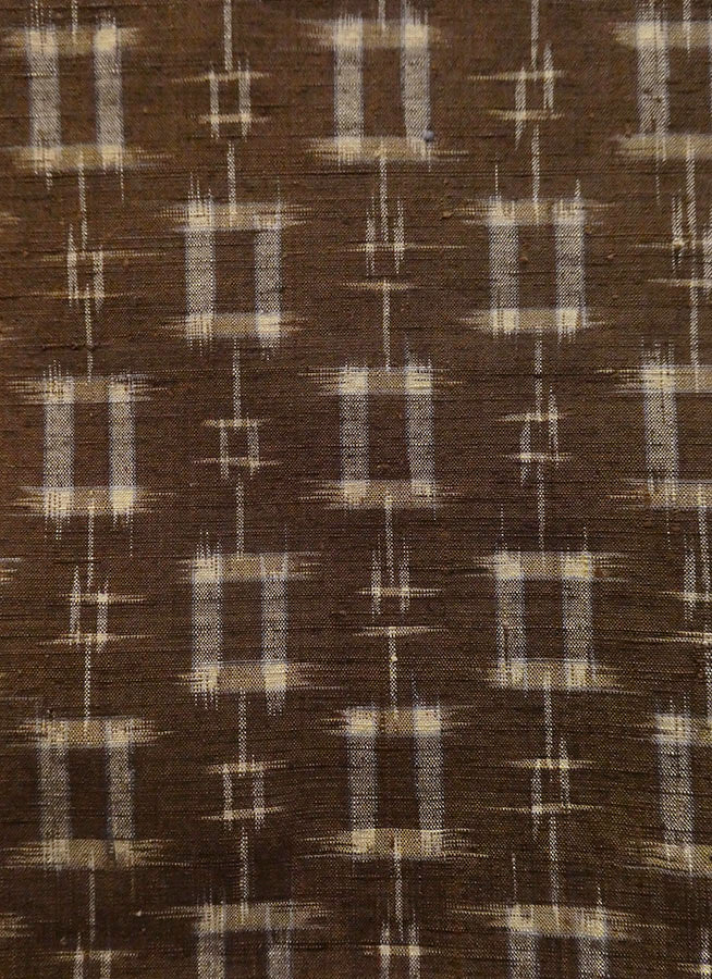The design of the cloth is a beautiful kasuri pattern done mainly in a kind of rich yet drab brown tone.