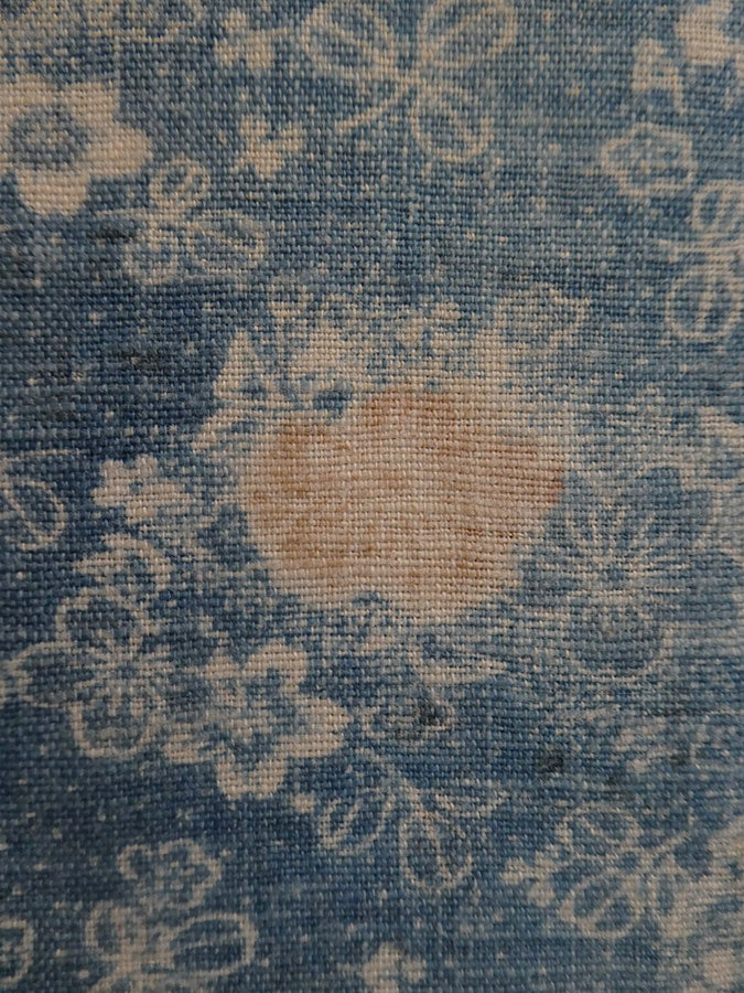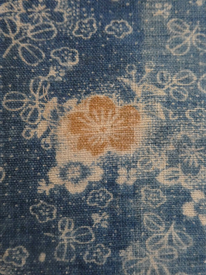 The length is a medium toned blue which, when it was new, was darker as can be seen by the segment on the upper, left hand area of the cloth. This piece was taken from a half underkimono and the darkened area would have been where the collar area was placed. The bottom of the length is finished with hand stitching.