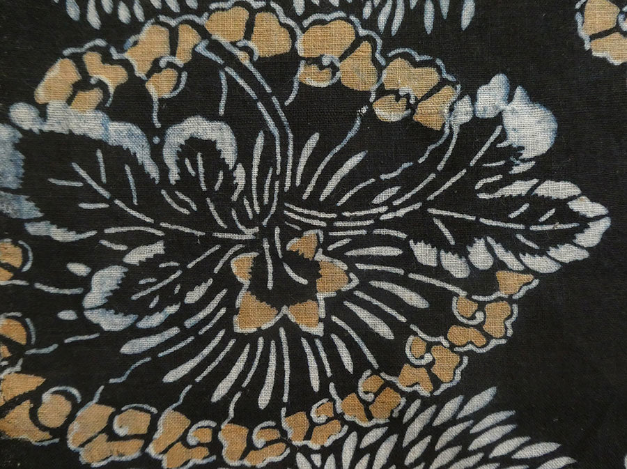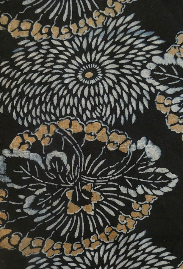 This length of katazome dyed cotton shows a curious pattern, that of large-scale chrysanthemums, half of which are seen from the back.