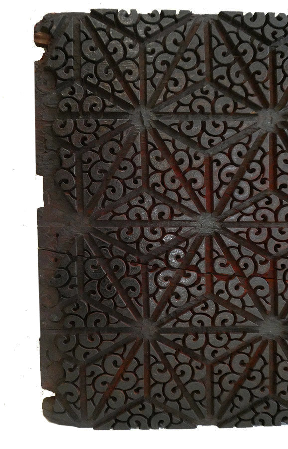 Sometimes boards are carved and fitted with drilled holes which let dye in in very specific areas however in the case of the one offered here, boards are carved in relief and in sets of mirror-image.  These relief carved boards would be clamped face-to-face and the raised areas would meet when clamped, and would resist dye.