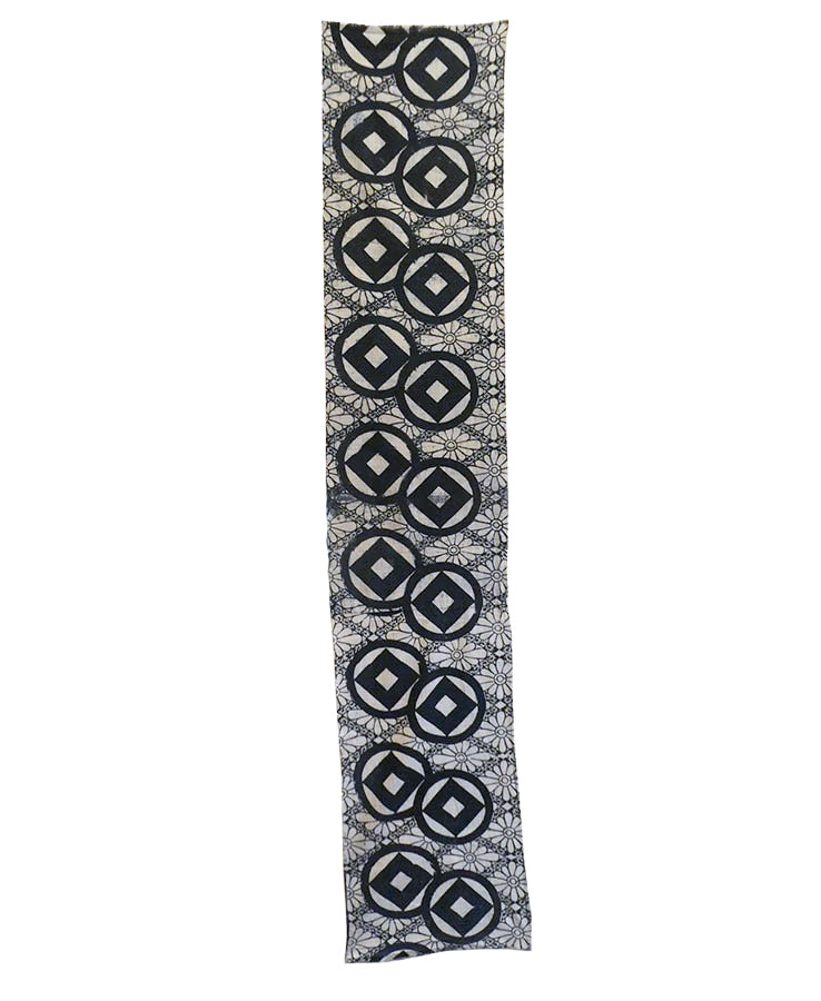 The length shows an unusual, large scale pattern of pairs of deeply toned family crests against a background of chrysanthemums that are shown as a repeat pattern of diamonds, the contrast between the bold and graphic images in the foreground against the delicate design in the background is worth noting.