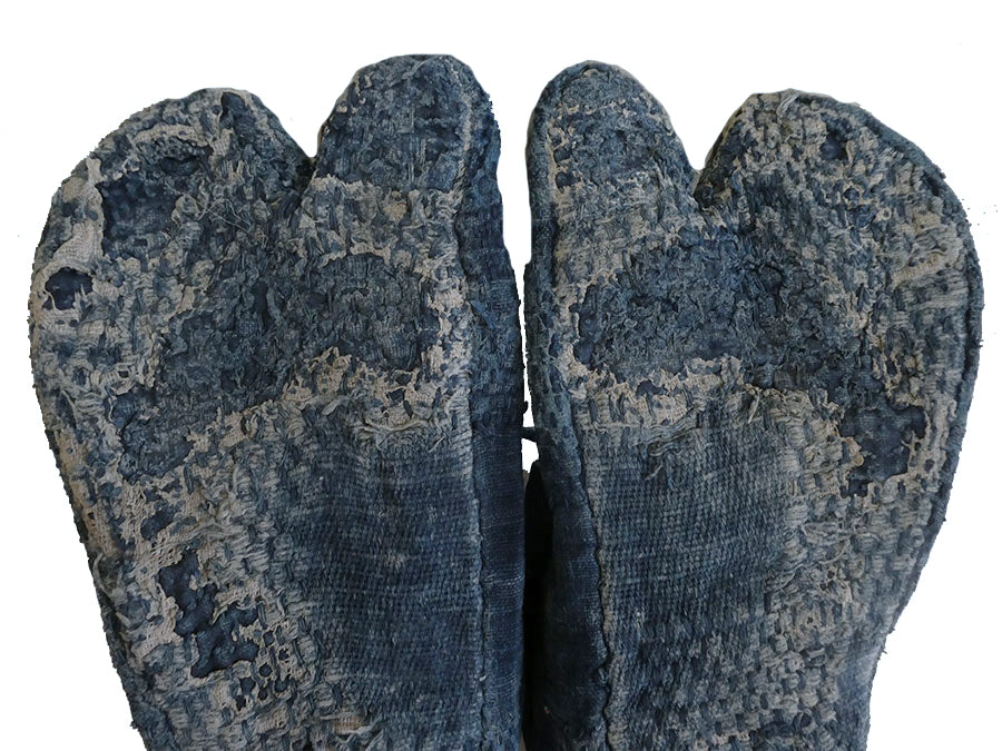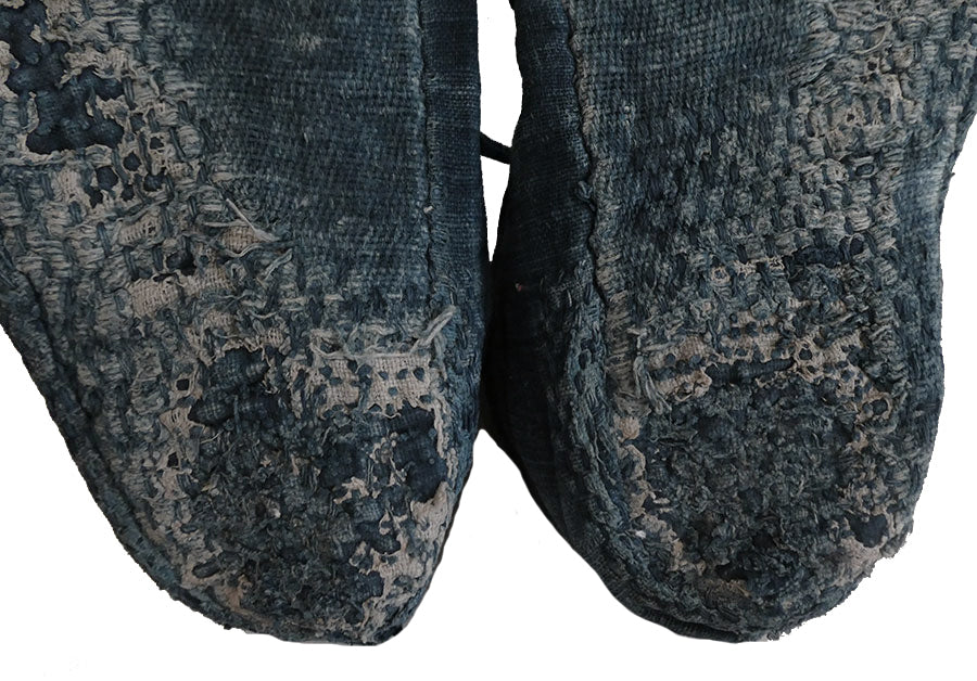 As can be seen in the accompanying photographs, this pair of tabi has been worn hard and this quality enhances their soulfulness and folk appeal. The wear is such that the tabi are not torn up or ripped apart by time or mishandling: these have retained their beautifully human characteristics and show themselves to be well-preserved and offering a glimpse into the rural life of old Japan.