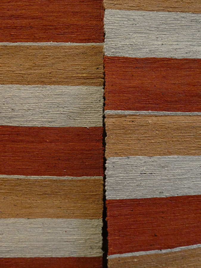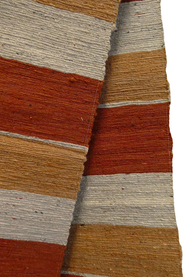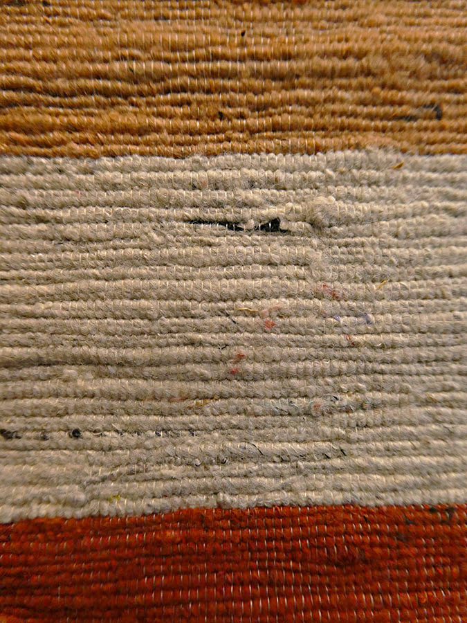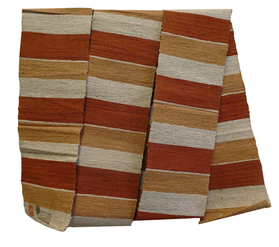 The white cotton warp gives the overall color scheme an easy color tone. The weft is fed in blocks of brick, mustard and ivory colors, creating a blocky striped pattern up the length of the obi. The overall visual result is a fairly uniform, striped design rendered in handsome colors.