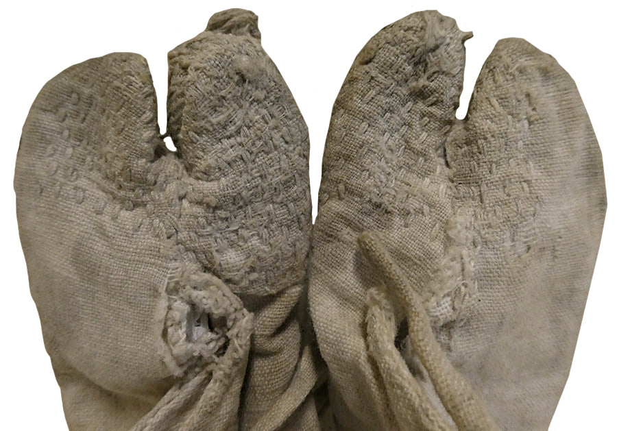 These rarely-found child-sized tabi are hand stitched from undyed cotton cloth and as can be seen on the accompanying detail photos they are well-used and they show some unmended loss, particularly to the toe area of the proper, left tabi.