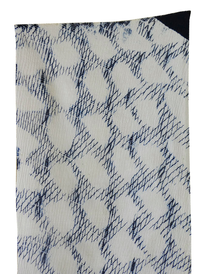 What is interesting about this length is that is one of many variants on arashi shibori whereby the design is based on blank spaces surrounded by dyed areas, a technique which must take tremendous skill and artistry to achieve--if you look closely at the accompanying photos you can see shape resisted "blank" areas which show texture.