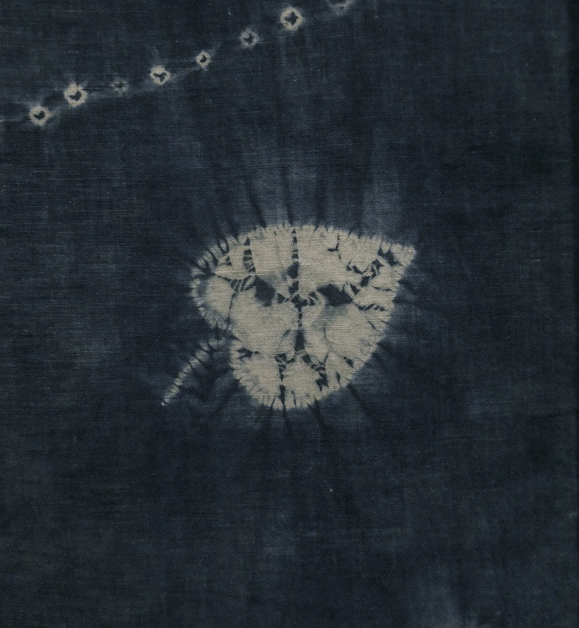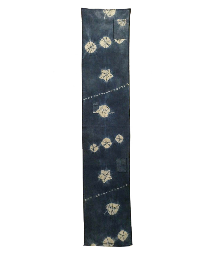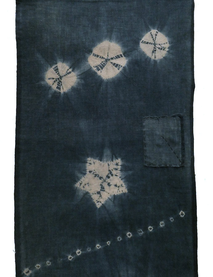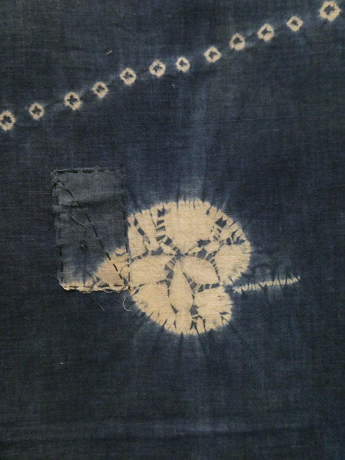 The pattern is beautiful and owes its attractiveness to the patches and stitching which are overlaid on the base cloth that shows sewn and tied shibori stars, leaves and circles.
