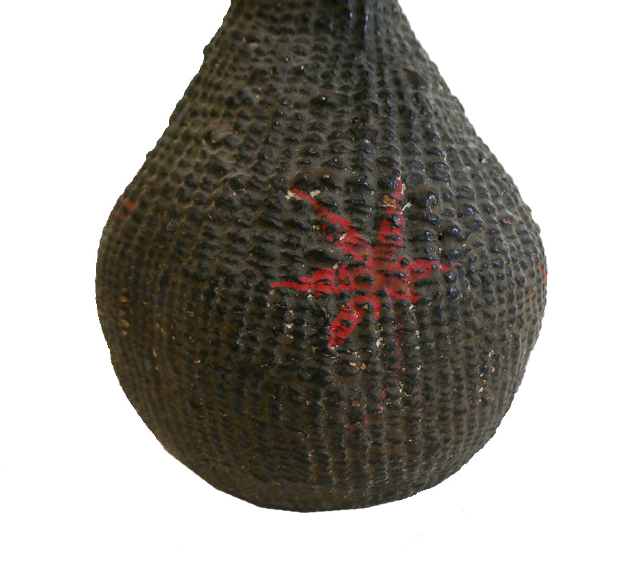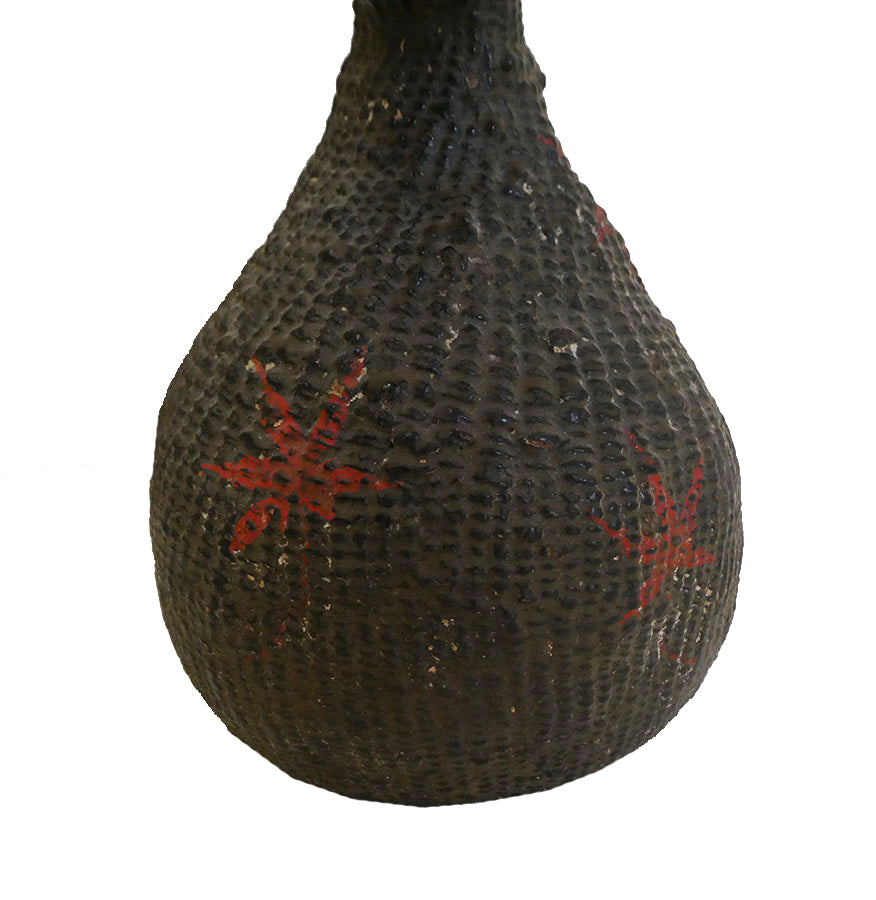 This is a flask that is woven from paper yarns, formed into the shape of a gourd and then lacquered and decorated with red lacquer maple leaves. Its stopper and cord are both missing.