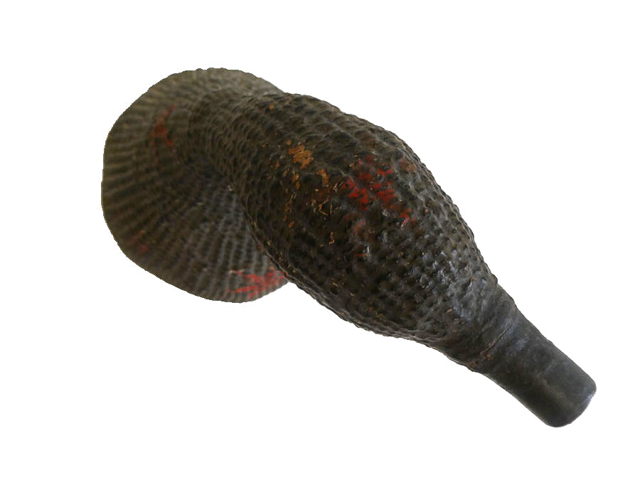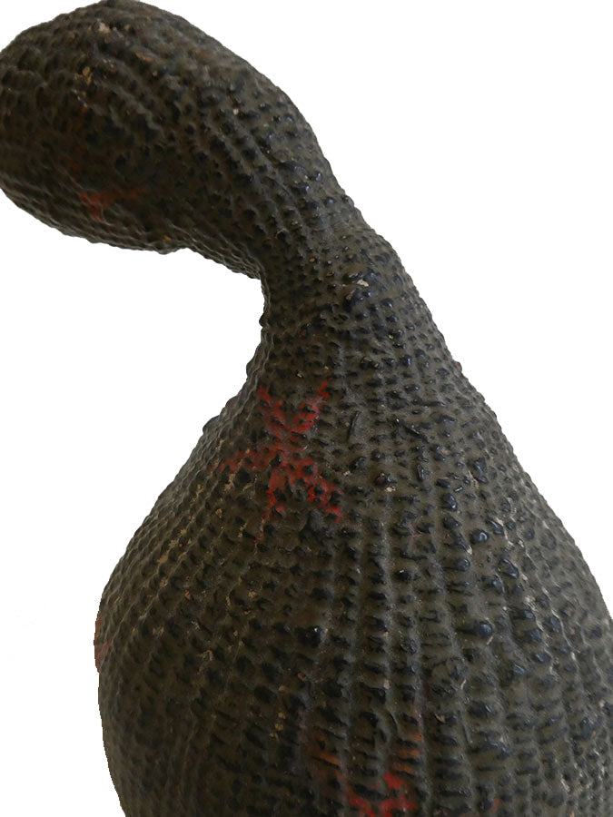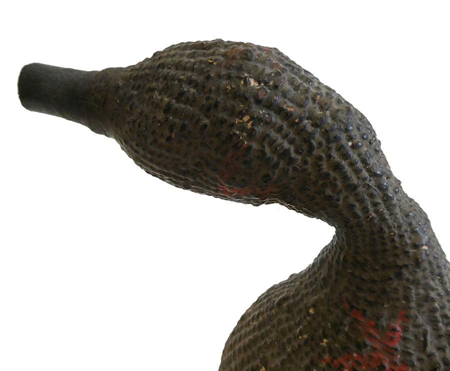 Such a flask might have contained water, but as dried gourds were hollowed out and use to contain sake for celebrations, it is likely this late Edo period object was used for that purpose. This kind of lacquered paper, gourd-shaped flask is of a type, however this one has a decidedly goose-like presence and it seems intentional.