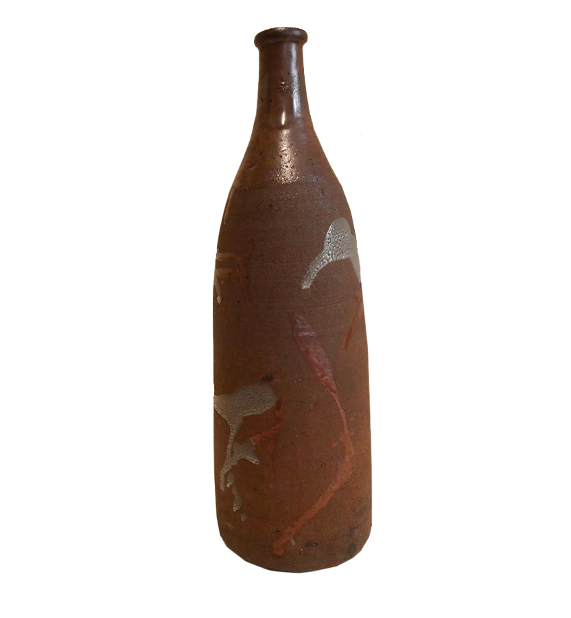 This sake flask or tokkuri shows as an elegant form with an unusual and appealing splashing of two tones of glaze on its body.