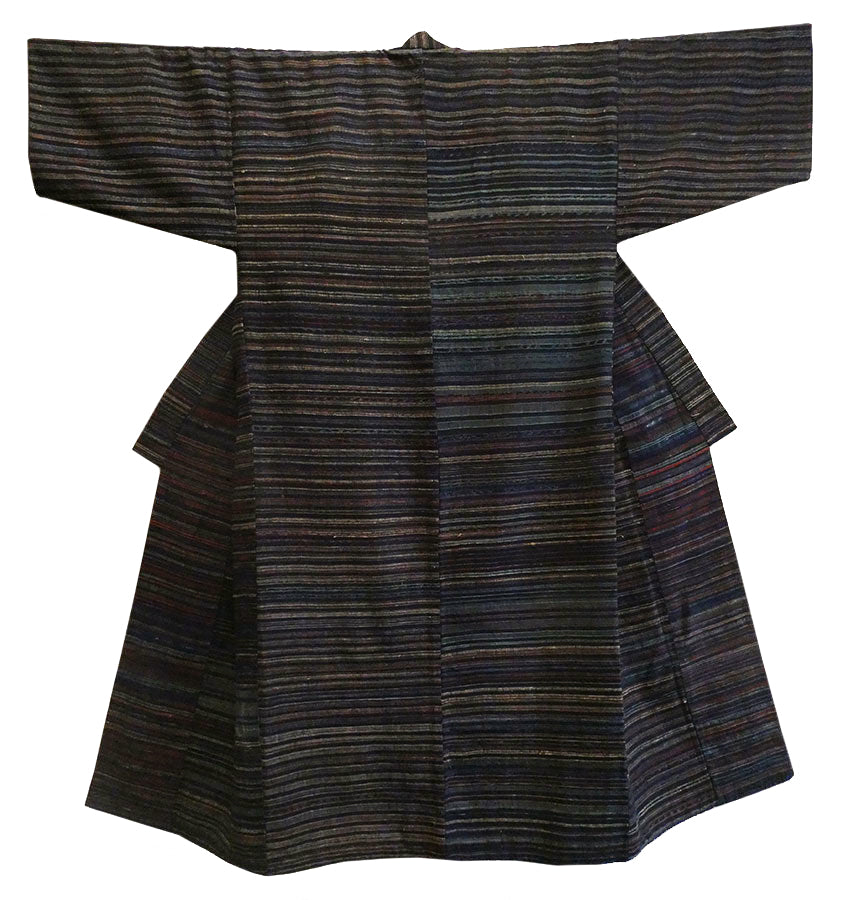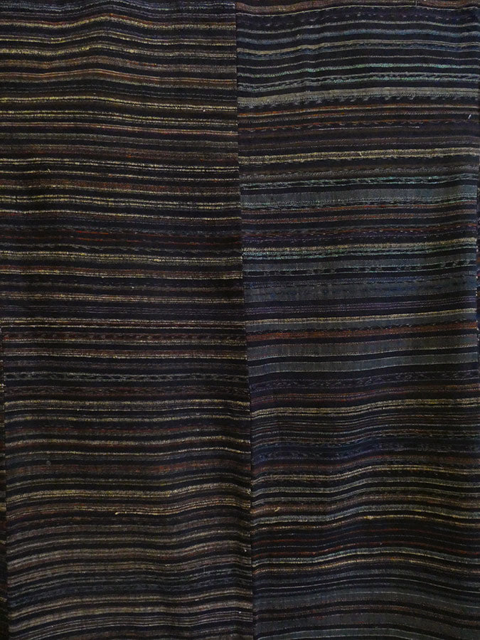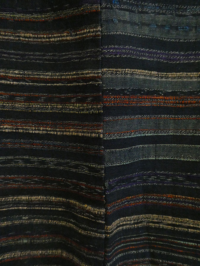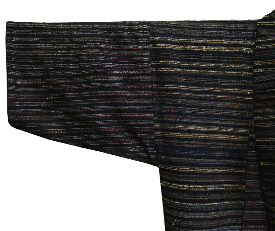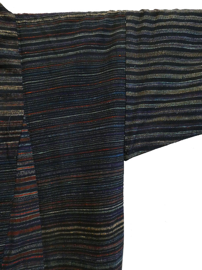 The jewel colored weft yarns are set dramatically against one another in narrow, horizontal bands, creating a kind of scintillating visual effect. The deepness of tone produced by this color banding is moody and beautifully restrained, much in keeping with traditional Japanese kimono used every day by ordinary people.