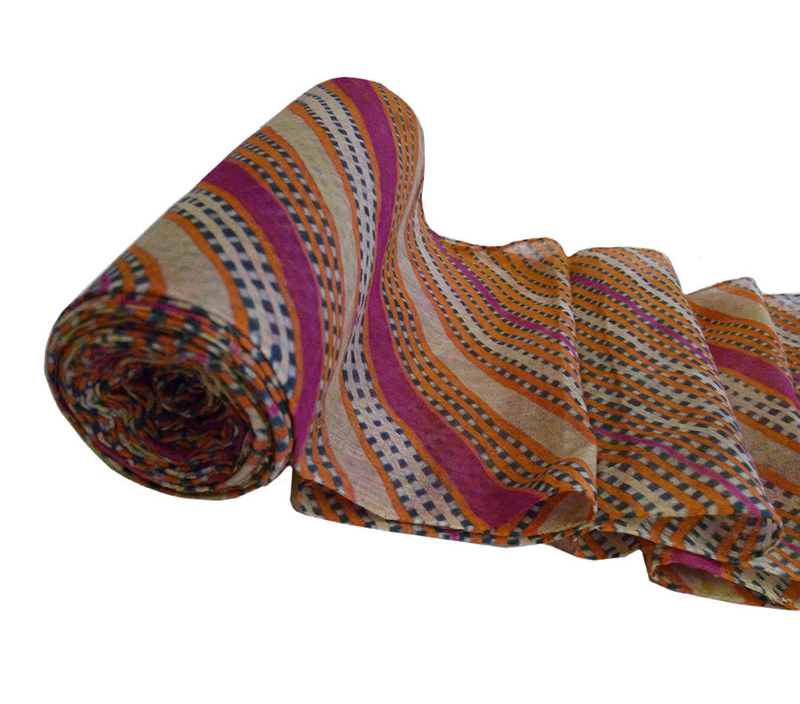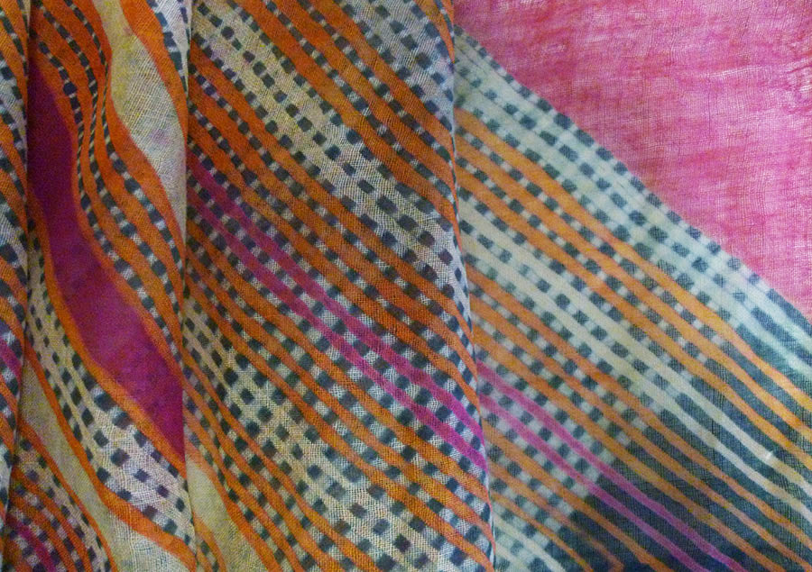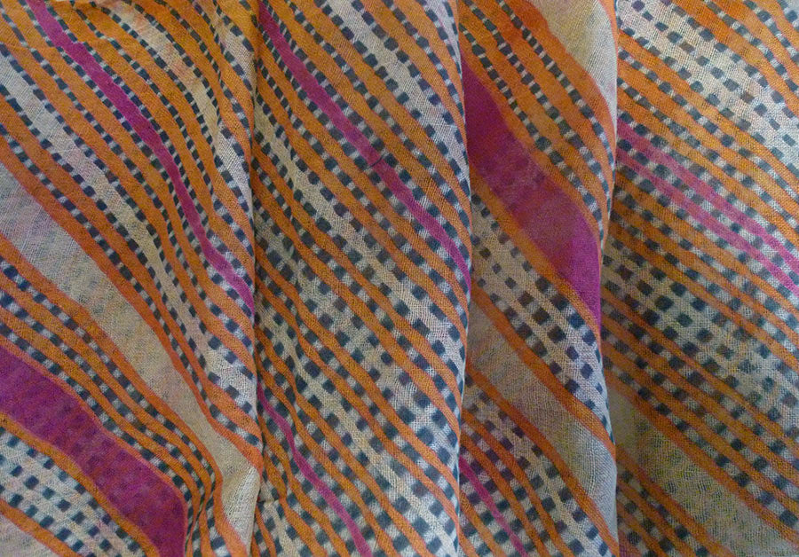 This cross-directional dyeing technique is called mothara. The coloration of this turban is a subtle, elegant and beautiful combination of orange, grey and fuchsia tones.